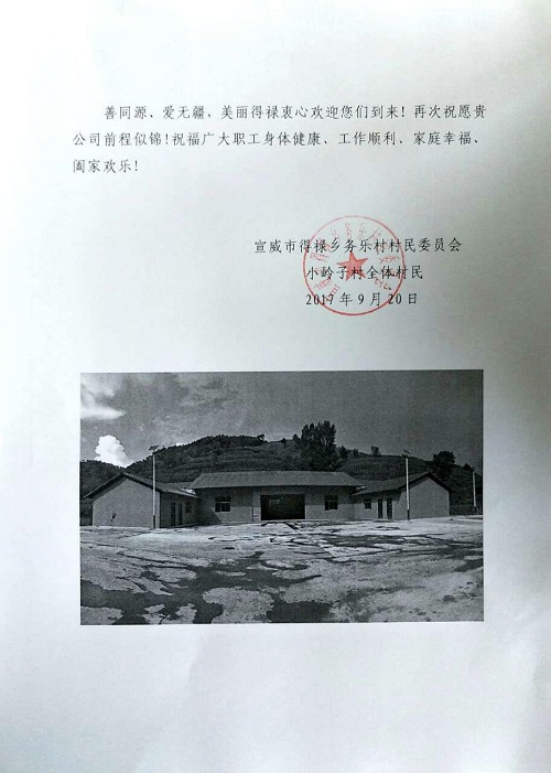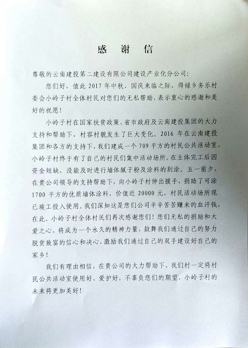 近日,建設(shè)產(chǎn)業(yè)化分公司收到來自宣威市得祿鄉(xiāng)務(wù)樂村委會(huì)小嶺子村全體村民的感謝信,感謝分公司對建蓋公共活動(dòng)室的幫助。